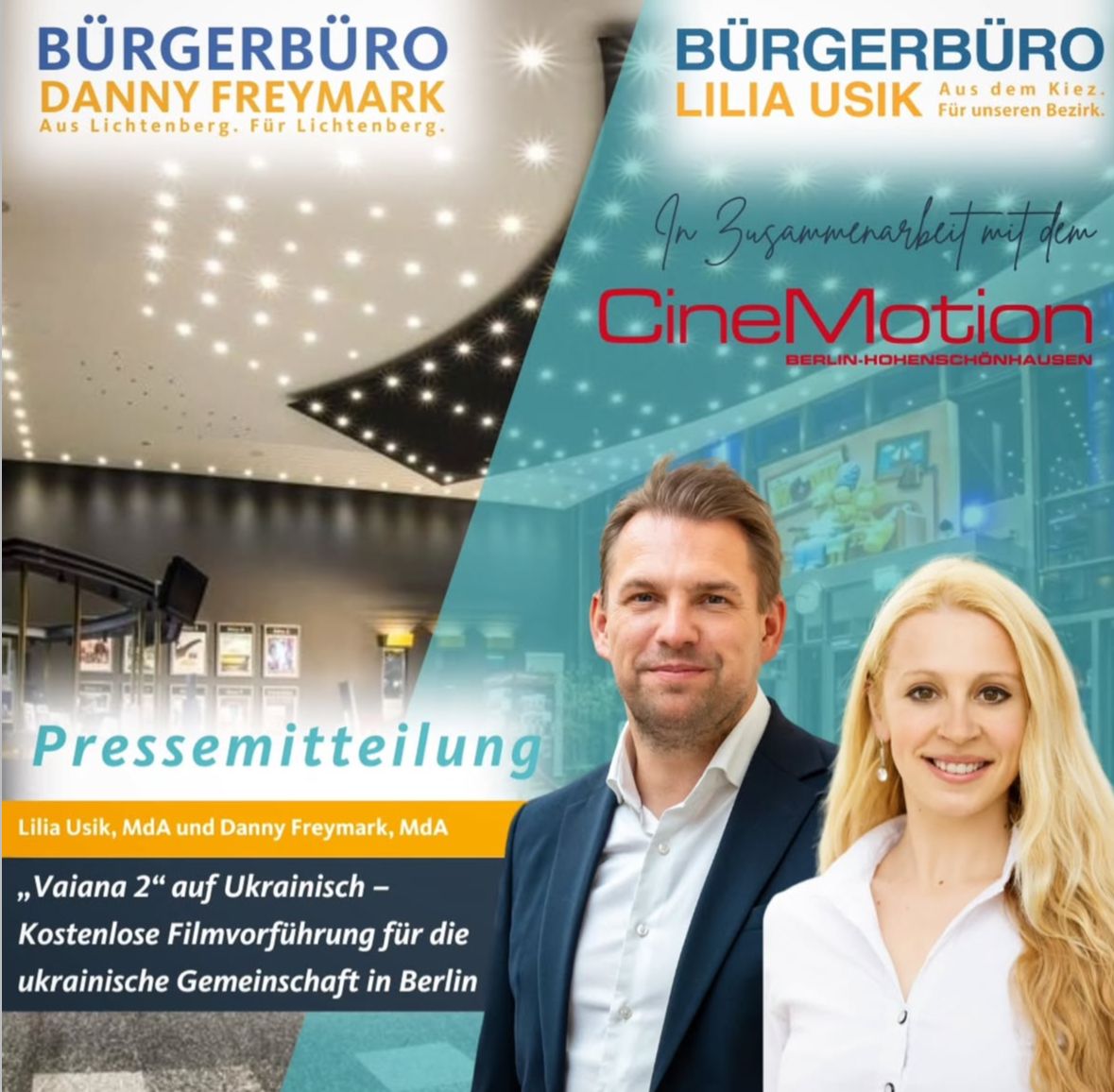 Der CDU-Bundestagskandidat und Abgeordnete Danny Freymark, die CDU-Abgeordnete Lilia Usik sowie André Pesek, Theaterleiter des CineMotion Berlin-Hohenschönhausen, laden herzlich zur besonderen Vorführung des Films „Vaiana 2“ in ukrainischer Sprache ein. Die Veranstaltung findet am Donnerstag, den 9. Januar 2025, um 18:00 Uhr im CineMotion Berlin-Hohenschönhausen, Wartenberger Straße 174, 13051 Berlin, statt und ist kostenlos.